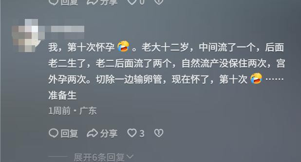 万万没有想到同类型的朋友还真不少,有一个广东的网友说自己现在是第10次怀孕,中间有自然流产的,也有人工流产的,还有宫外孕的,还切除了一边输卵管,现在已经第10次怀孕准备生了。